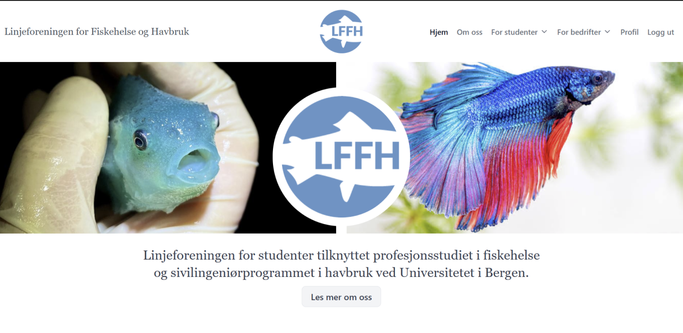 Funksjonell nettside for Linjeforeningen for Fiskehelse og Havbruk, med mulighet for blant annet innlogging, arrangementopprettelse og påmelding til arrangementer